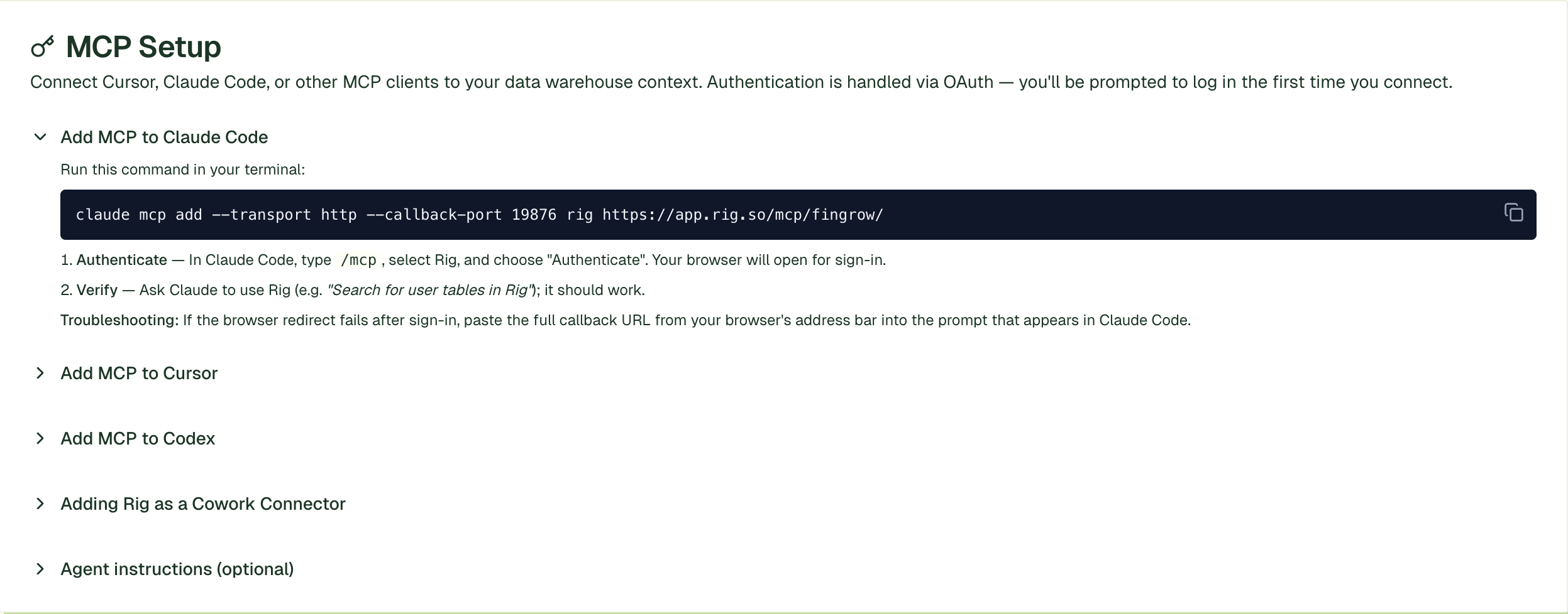 A walkthrough of connecting Rig as an MCP server inside Claude.