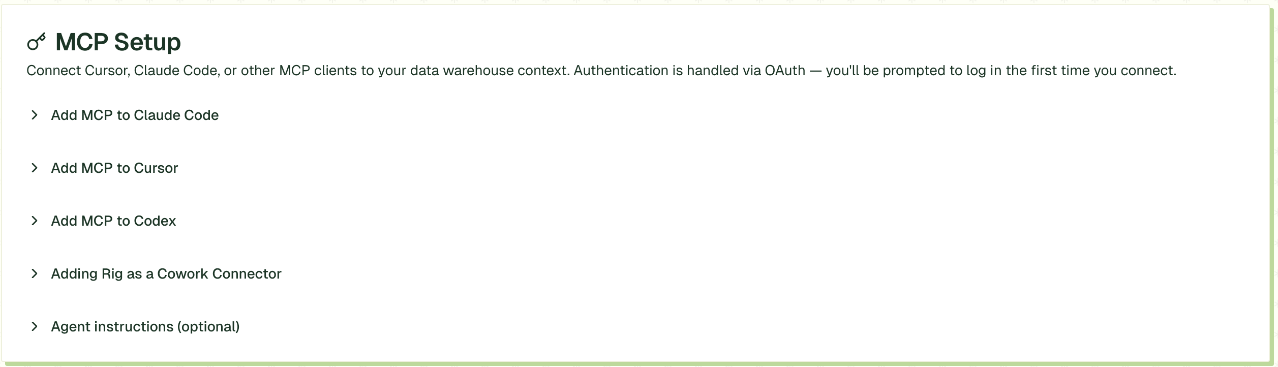 Rig sits between your warehouse and your AI tools (Claude, Cursor, ChatGPT, custom agents). Rig adds the context layer that explains what tables mean, how they join, and who has access to what data, and serves it to your AI tool over MCP.